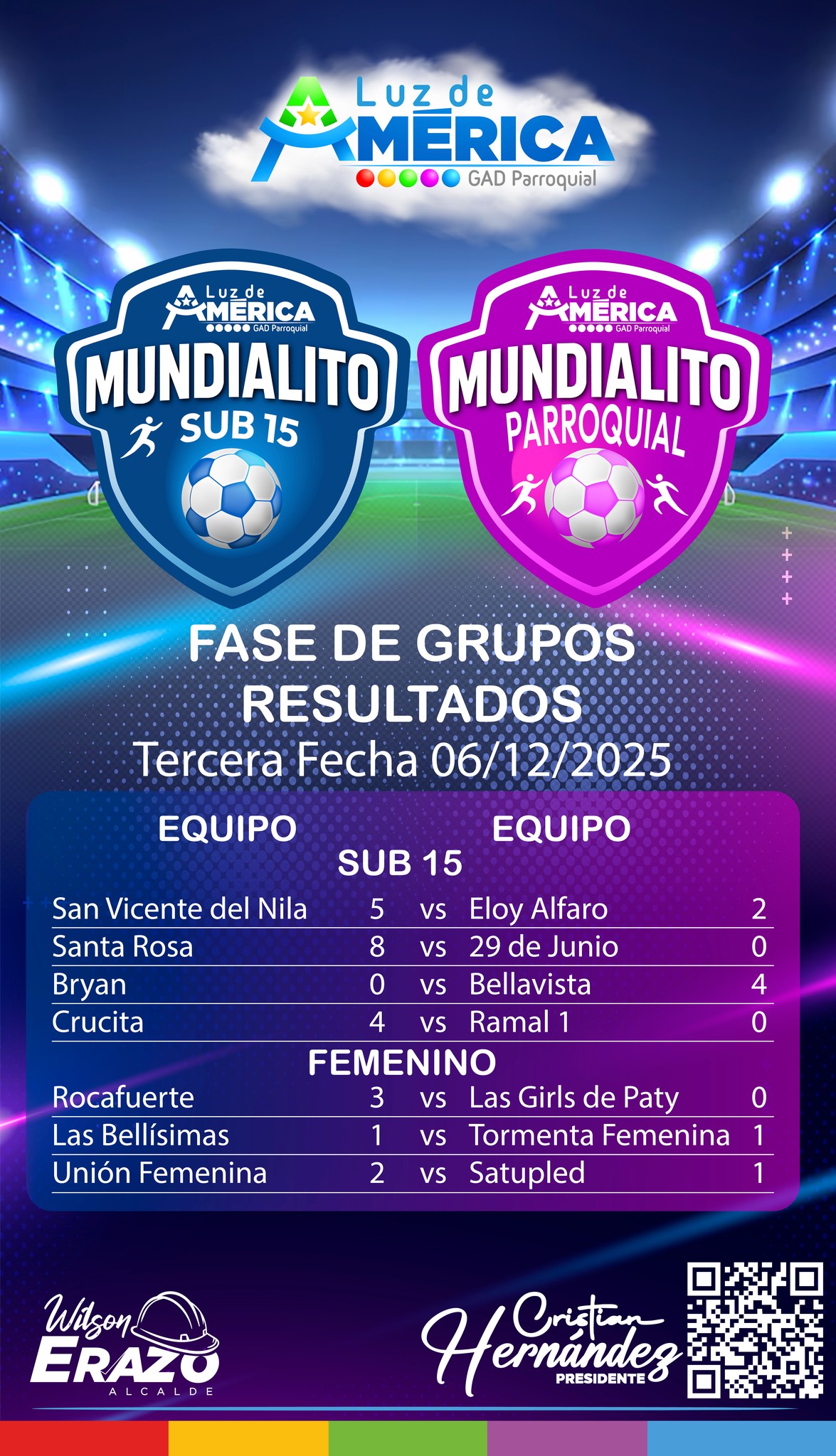 El pasado 06 de diciembre se vivió una jornada llena de emoción tras jugarse los encuentros de la Tercera Fecha correspondiente a la Fase de Grupos de la Copa Wilson Erazo. Los equipos demostraron entrega, talento y un gran nivel competitivo en cada uno de los encuentros.