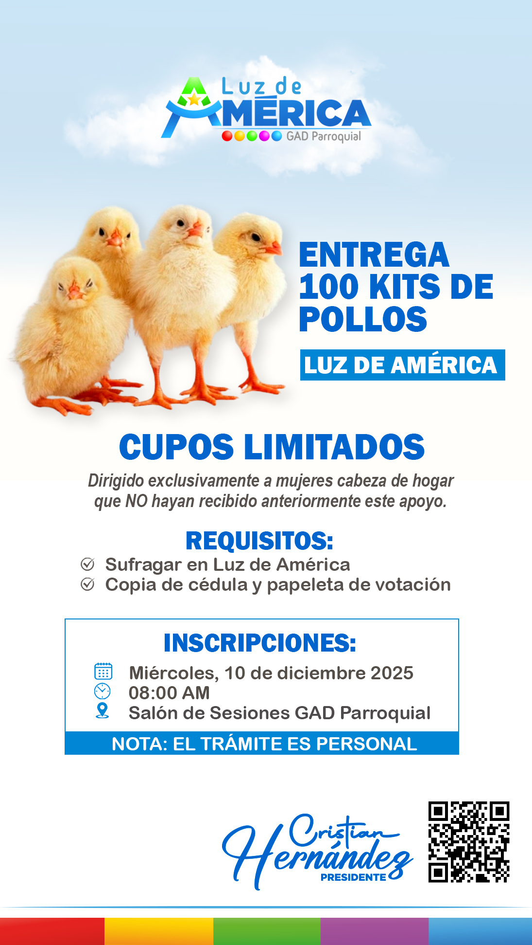El GAD Parroquial Luz de América informa a la ciudadanía que se realizará la inscripción para la entrega de 100 kits de pollos, dirigida exclusivamente a mujeres cabeza de hogar que NO hayan recibido este apoyo anteriormente.