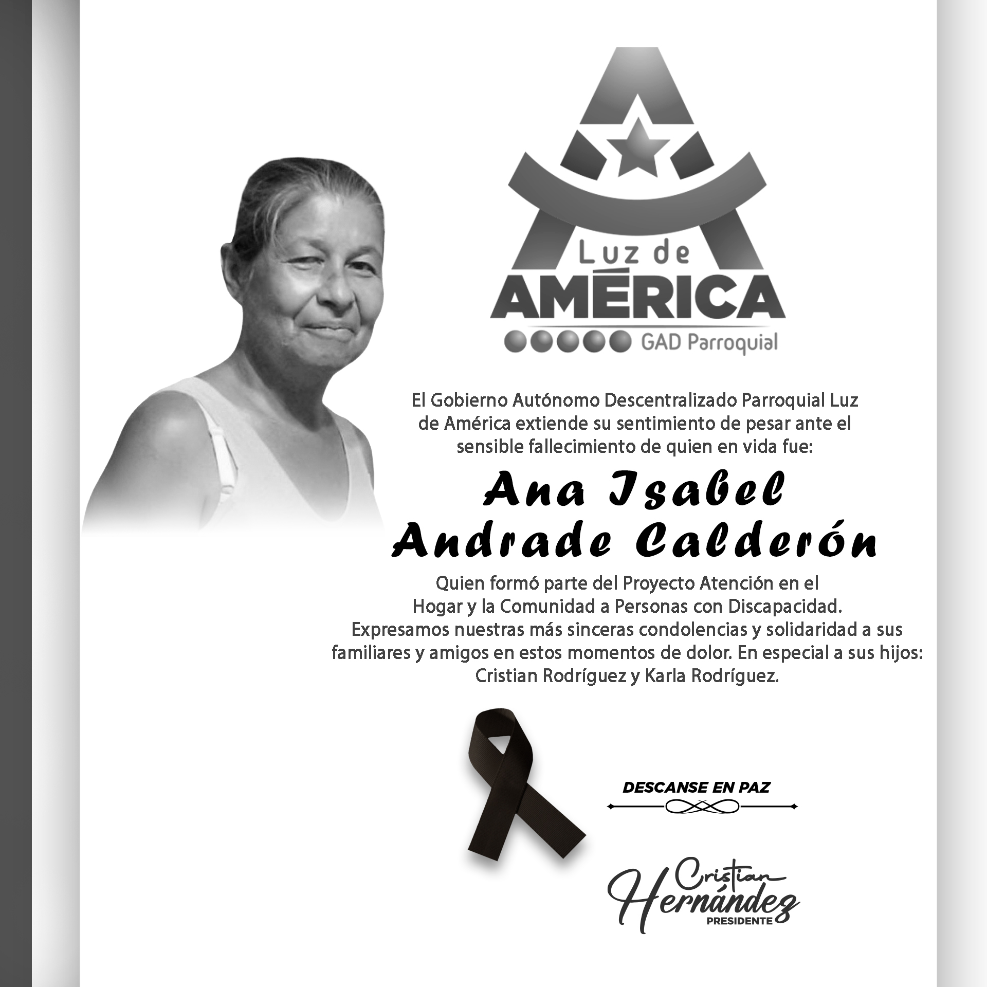 El Gobierno Autónomo Descentralizado Parroquial Luz de América extiende su sentimiento de pesar ante el sensible fallecimiento de quien en vida fue: