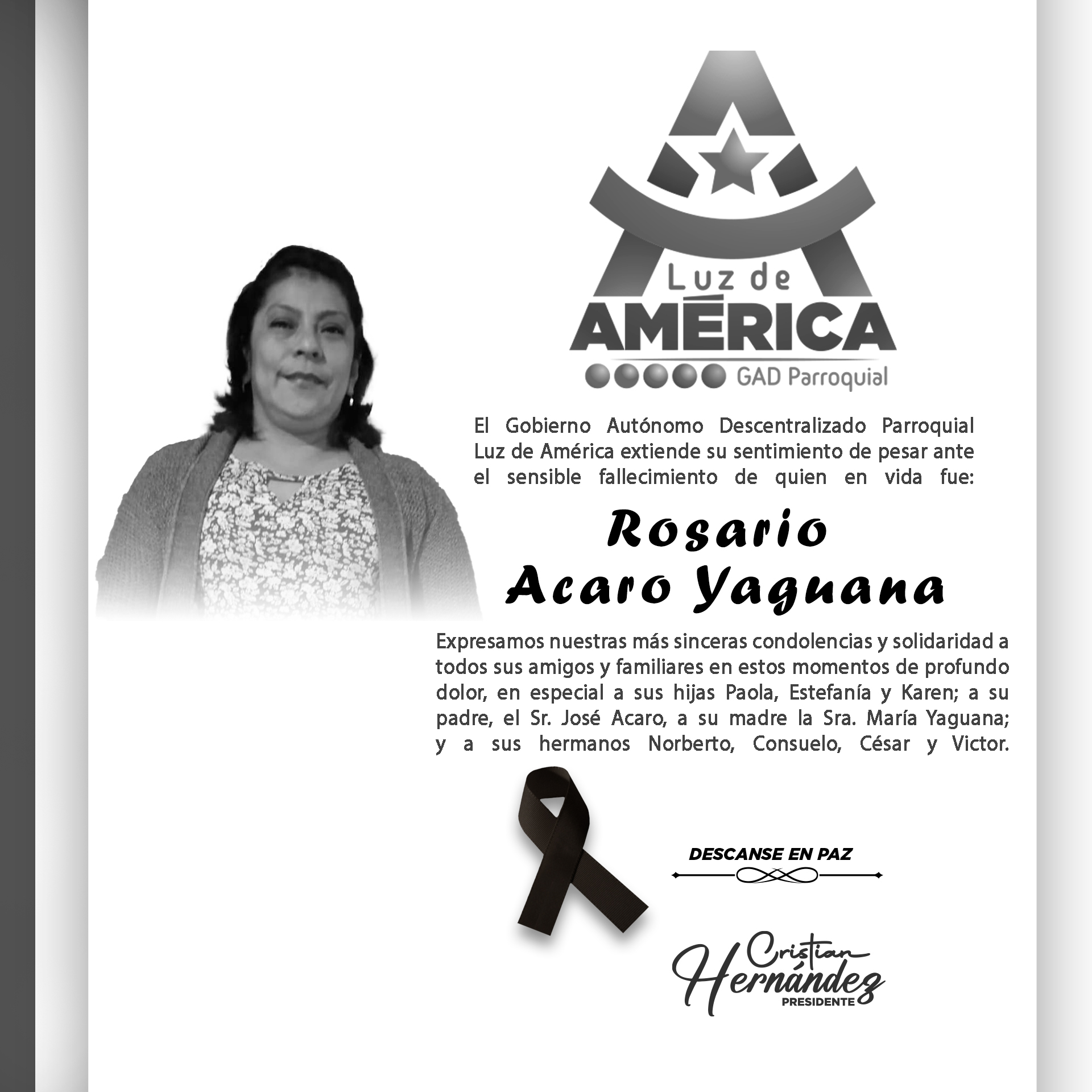 Expresamos nuestras más sinceras condolencias y solidaridad a todos sus amigos y familiares en estos momentos de profundo dolor, en especial a sus hijas Paola, Estefanía y Karen; a su padre, el Sr. José Acaro, a su madre la Sra. María Yaguana; y a sus hermanos Norberto, Consuelo, César y Victor.